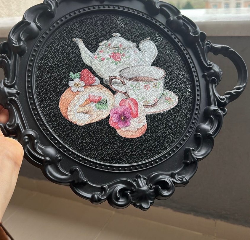 Siyah çerçeveli, çaydanlık, fincan ve çiçekli tatlı desenleriyle süslenmiş dekoratif tablo. Mekâna hoş bir hava katar. Çay kahve tebsisi