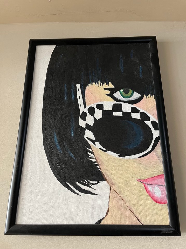 Siyah çerçeveli, siyah saçlı ve kareli güneş gözlüklü kadın portresi modern tablo. Canlı detaylar içerir, yeşil göz ve pembe dudaklar öne çıkar.