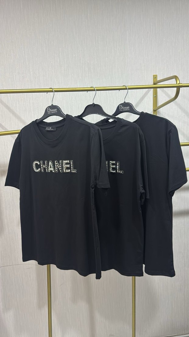 Kısa kollu, yuvarlak yaka, siyah salaş tişört. Önünde taş detaylı CHANEL baskısı bulunur. Rahat ve şık, sentetik kumaştan üretilmiştir.