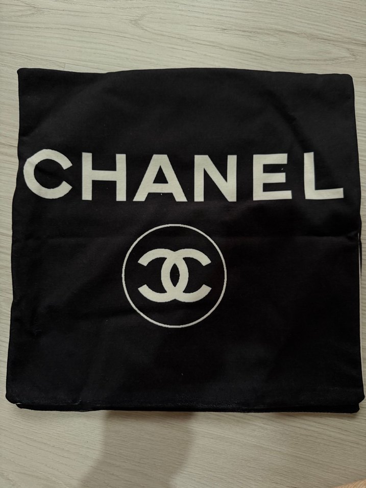 Yumuşak kumaştan, siyah zemin üzerine baskılı Chanel logosu bulunan kırlent kılıfı. ️