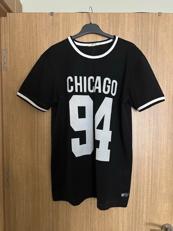 File kumaştan, yarım kollu, bol kesim, yuvarlak yaka siyah tişört. Üzerinde "CHICAGO 94" baskısı ve düğmeli detaylar bulunur. Spor tarzına uygun.