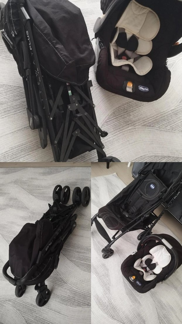 Chicco marka siyah bebek arabası ve ana kucağı seti, katlanabilir yapı ve konforlu yastıklı oturma alanı sunar.