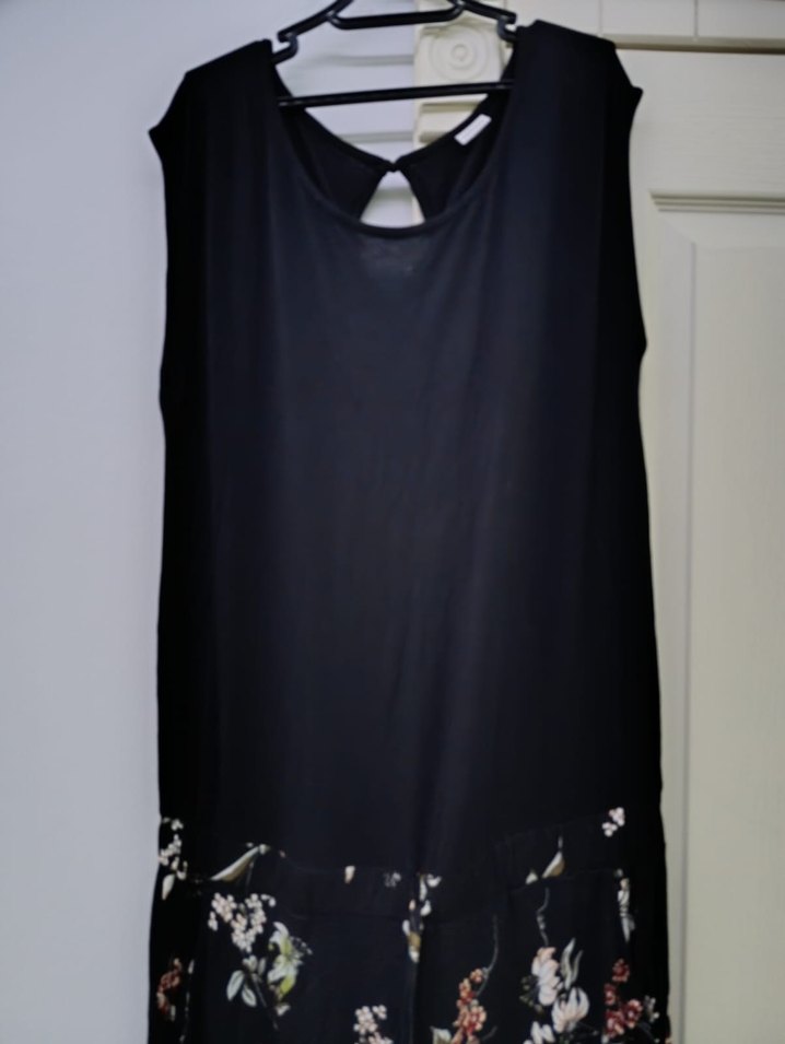 Siyah çiçekli kolsuz ve bol penye tulum, yuvarlak yakalıdır. iki kol arası 52 boy 1.55 cm.