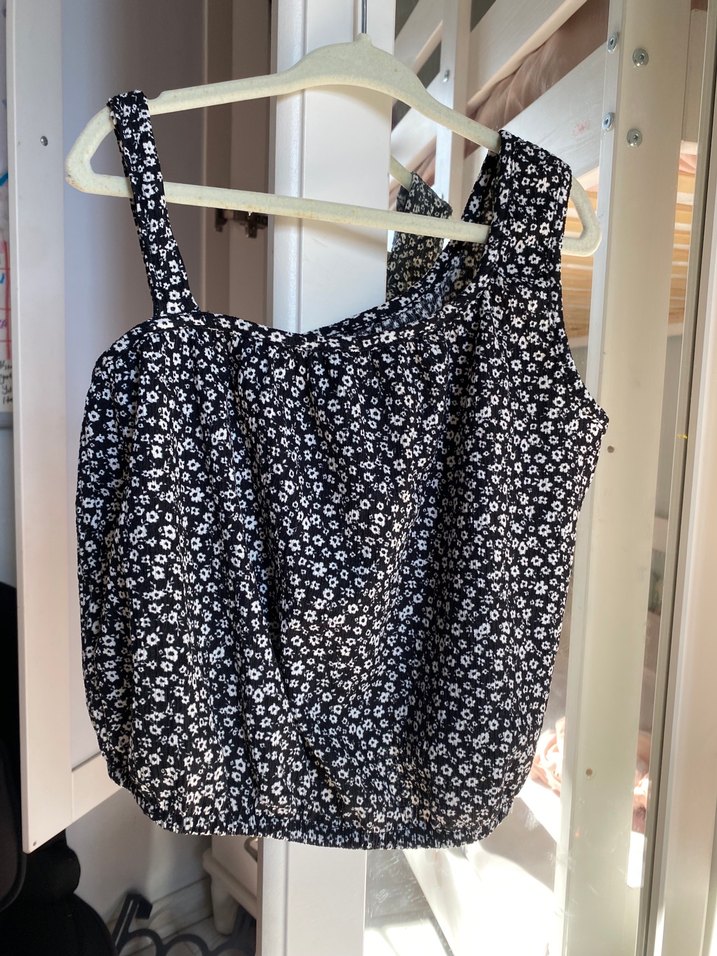 Pamuk kumaştan, askılı ve drapeli tasarıma sahip, salaş kesim kız çocuk bluz Siyah zemin üzerinde küçük çiçek desenleri bulunur, midi boyda ve günlük kullanıma uygun.