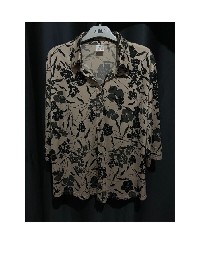 Bej renkli, uzun kollu, düğmeli ve yakalı gömlek. Siyah çiçek desenli, rahat kalıp ve yumuşak sentetik kumaştan üretilmiş, günlük sokak tarzı için uygundur.