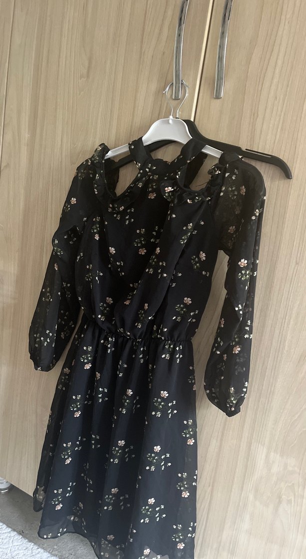 siyah elbise, bol kesim, askılı ve straplez yaka, fırfır detaylıdır. Koyu çiçek desenli, bohem gotik tarzda,