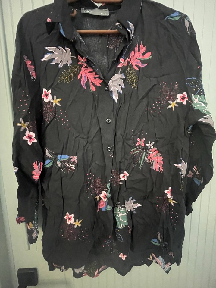 Siyah, uzun kollu, çiçek desenli, düğmeli yakalı bohem tarzda bol kesim kadın gömleği.