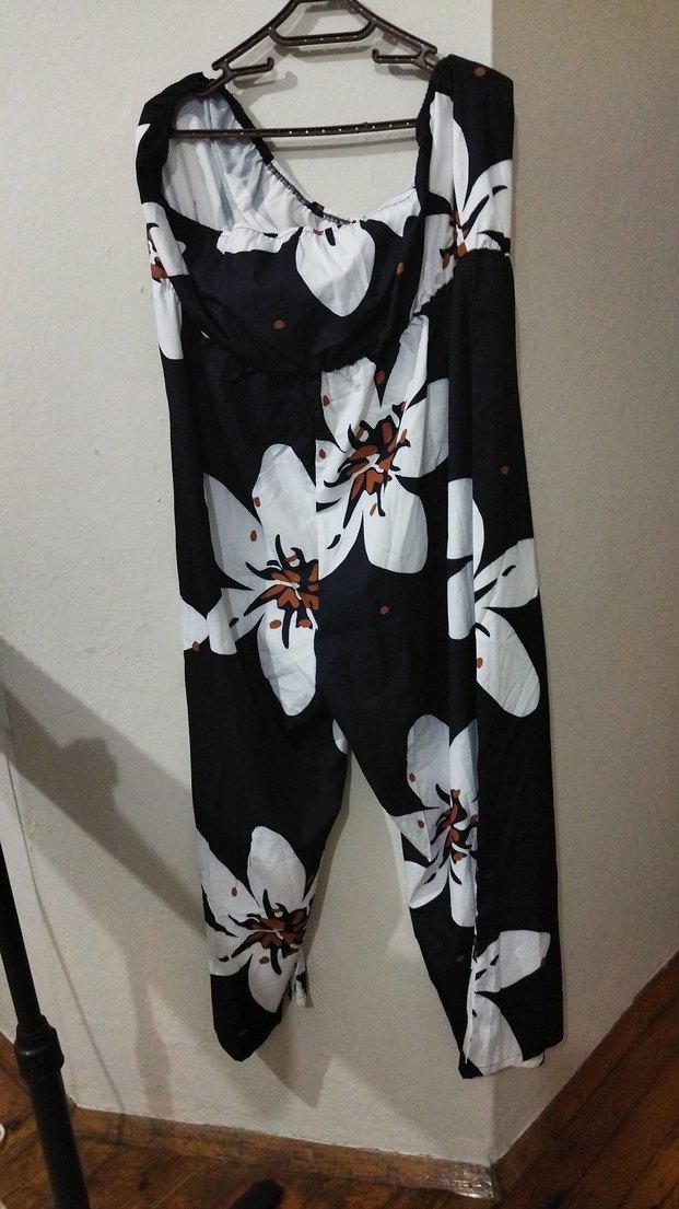 Siyah, büyük beyaz çiçek desenli, askısız ve drapeli tasarıma sahip, bol kesim kadın tulumu. Sentetik kumaştan üretilmiş, sokak modasına uygun ve günlük kullanım için ideal.