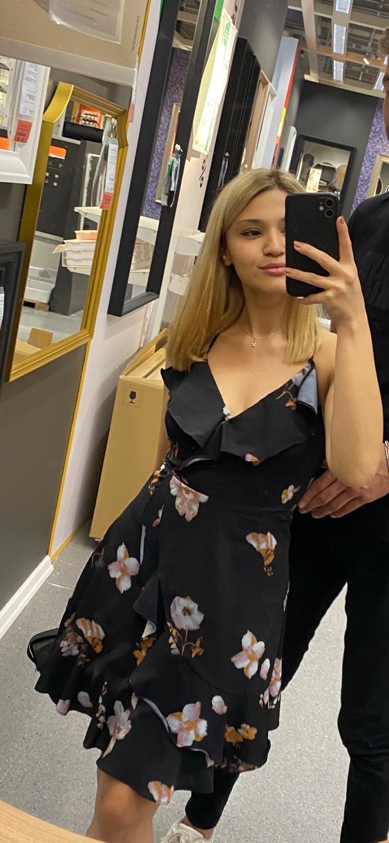Çiçek desenli, drapeli ve askılı siyah mini elbise, yumuşak sentetik kumaştan, romantik akşamlar için uygun.