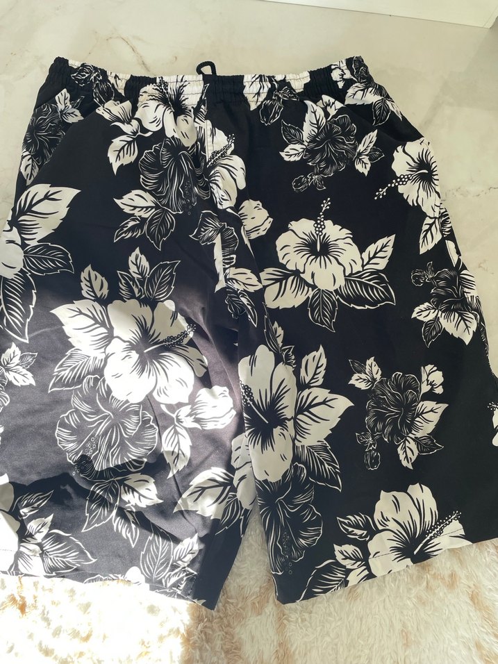 Bol kesim midi uzunlukta, siyah zemin üzerine beyaz çiçek desenli erkek şort, düğmeli tasarımıyla günlük sokak giyimine uygundur.