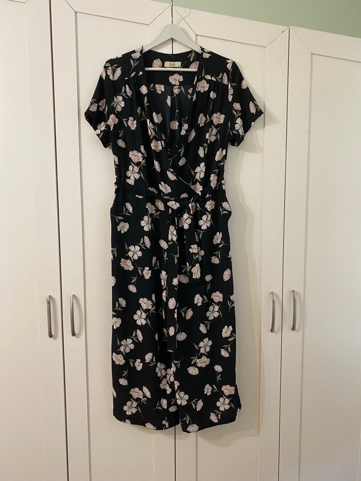 Siyah zemin üzerine çiçek desenli, uzun ve bol kesim hamile elbisesi. V yaka ve kısa kollu, dökümlü yapıda, yumuşak sentetik kumaştan üretilmiştir.