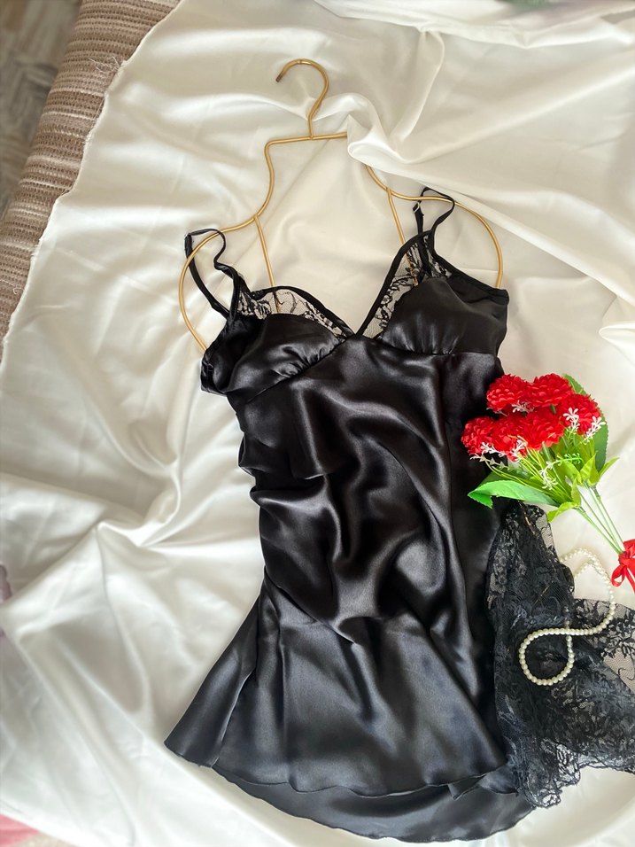 Siyah saten kumaştan, ince askılı ve çiçek desenli dantel detaylı, kısa boylu ve vücuda oturan glam gotik tarzda gecelik.
