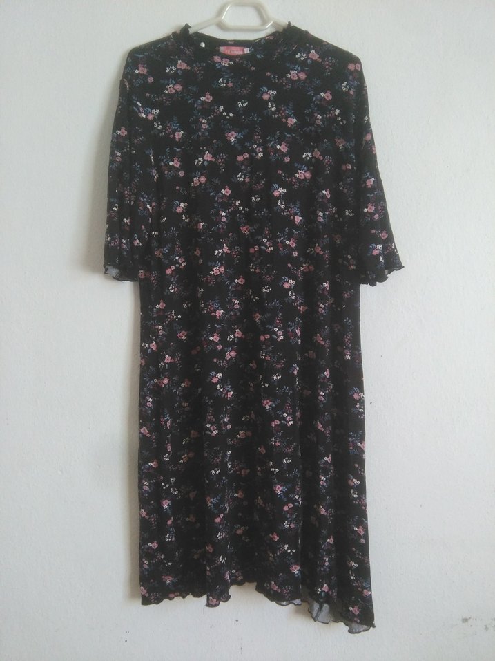 Yüksek yakalı, kısa kollu ve bol kesim siyah elbise. ince çiçek deseni ile günlük kullanım için uygundur.