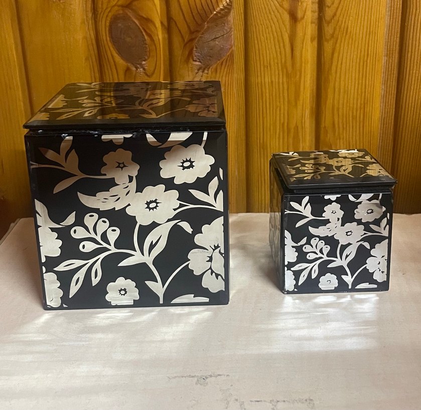 İki farklı boyda, beyaz çiçek desenli siyah makyaj organizeri. Makyaj malzemelerinizi düzenlemek için kullanışlı.