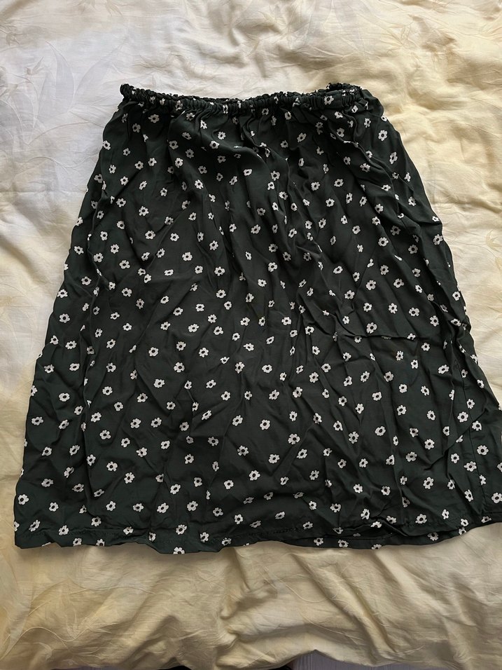 Siyah, çiçek desenli, bol kesim ve drapeli midi eteği, günlük sokak stili için minimalist ve rahat bir seçenek.