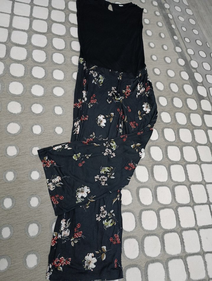 penye kumaştan, koyu renkli çiçek desenli tulum. Günlük kullanım için bohem tarzda, detaylıdır. tulumun iki kol arası 52 boy 1.55 cm kusursuz ürün.