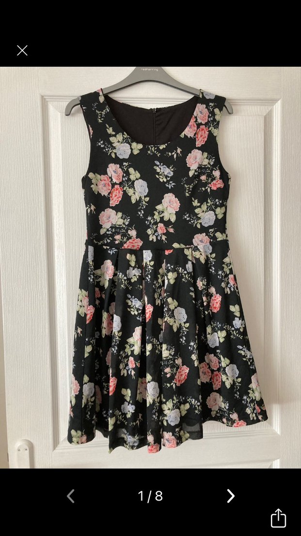 Siyah çiçek desenli, U yakalı, kolsuz mini elbise. Belden oturan ve fırfırlı detaylara sahip, trend günlük stil için uygun.