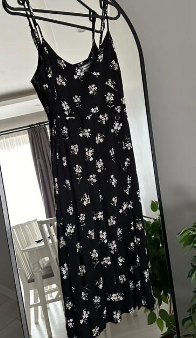 Siyah renkte, uzun, bol kesim ve drapeli, V yakalı, askılı, koyu çiçek desenli elbisedir. Günlük kullanıma uygundur.