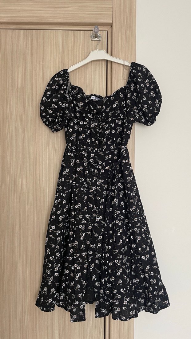 Siyah uzun elbise, tekne yaka, kabarık kollar ve çiçek desenli. Fırfır detaylı, bol kesim, sentetik kumaştan bohem gotik tarzda.