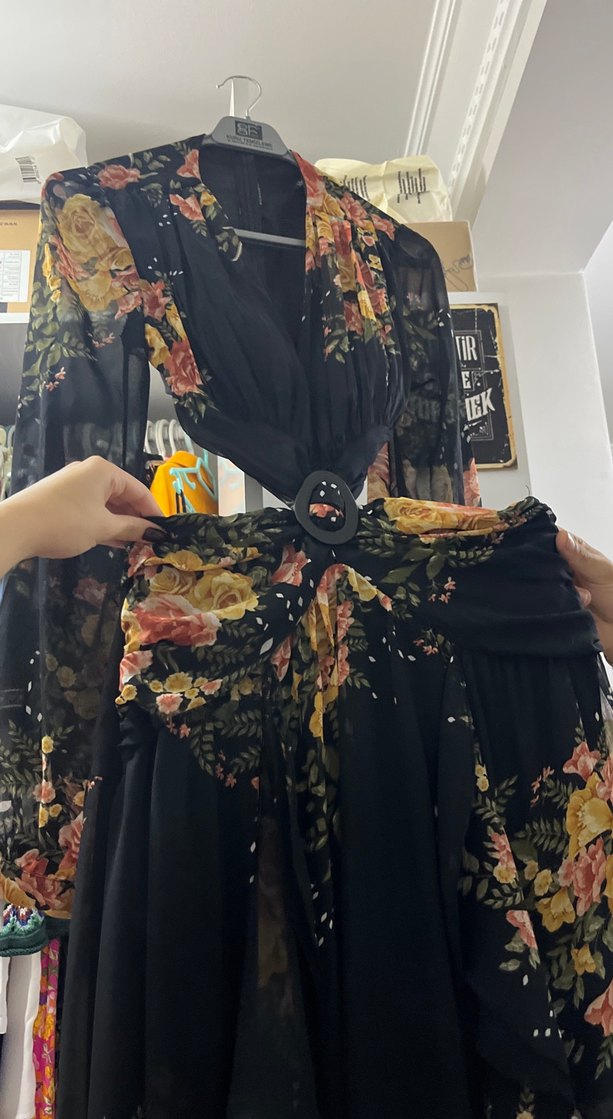 Siyah, uzun elbise, bol kesim ve drapeli, ipeksi kumaşla çiçek desenlerine sahip. Askılı kolları ve gotik tarzıyla romantik akşamlar için ideal. bel dekolteli