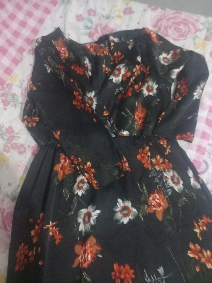 Siyah uzun elbise, bol kesim ve drapeli tasarıma sahip. Uzun kollu, V yaka ve çiçek desenlidir. Bohem tarz için uygundur.