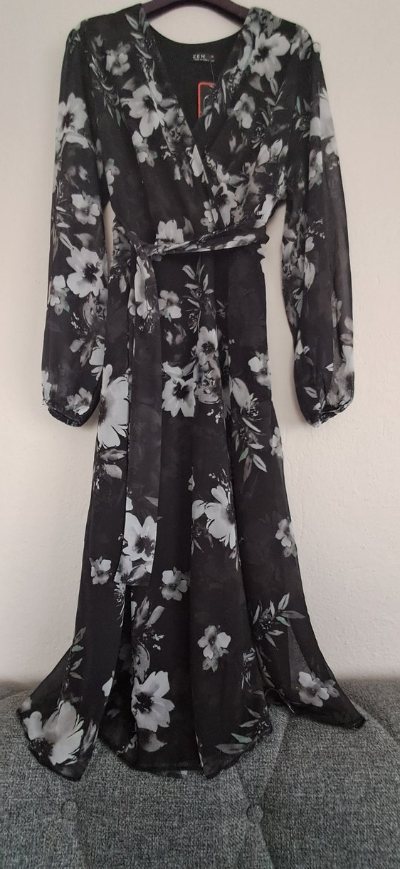 Siyah, çiçek desenli uzun elbise, bol kesim ve drapeli detaylara sahiptir. kısa kolları ve kayık yakasıyla bohem tarzını yansıtır.