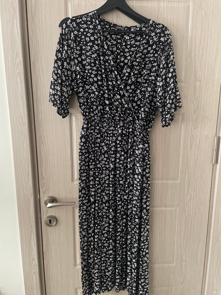Siyah uzun elbise, kısa kollu, V yaka ve bol kesimdir. Pileli tasarımı ve koyu çiçek desenine sahiptir, yumuşak sentetik kumaştan üretilmiştir.