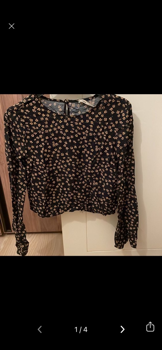 Uzun kollu. Kollarında küçük yırtmacı var siyah mini bluz, çiçek desenli sentetik kumaştan, günlük rahat sokak stili için uygun.