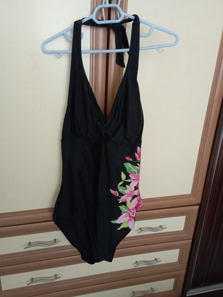 Siyah, drapeli yakalı ve yan tarafında canlı çiçek baskılı, uzun ve vücuda oturan kolsuz mayo.