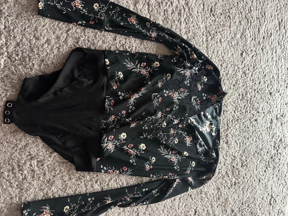 Siyah, sentetik kumaştan yapılmış, çiçek desenli, bol kesim, uzun kollu, V yakalı ve düğmeli kadın bluz. Gotik ve bohem tarzını yansıtır.
