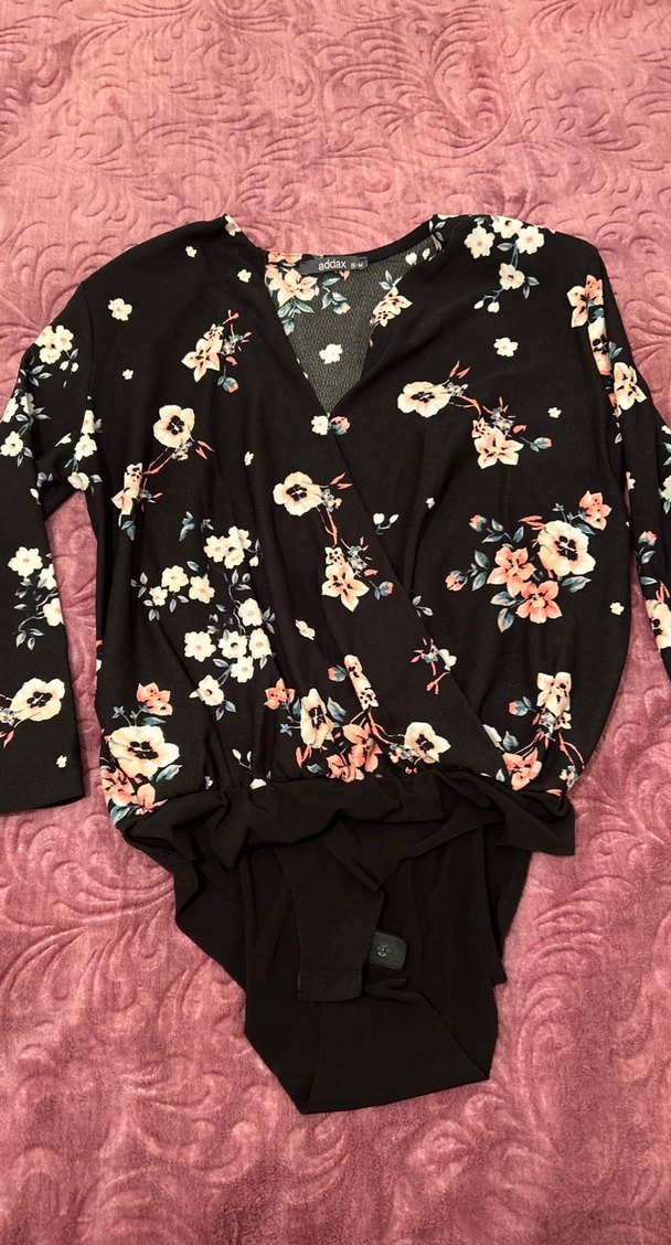 Bol kesim, uzun kollu, V yakalı düğmeli kadın bluz. Siyah zemin üzerine çiçek desenli, yumuşak sentetik kumaştan, günlük rahat kullanıma uygun. Alttan çıtçıtlı.