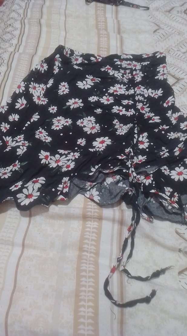 Siyah renkte, çiçek desenli ve volan detaylı, bol kesim mini etek, bohem sokak stili için uygun.