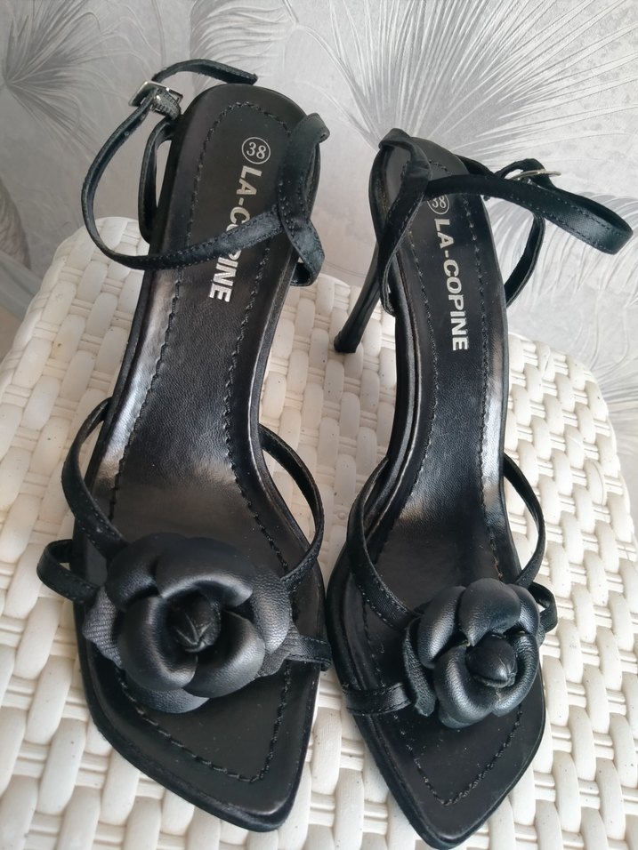 LA-COPINE markalı, siyah çiçek detaylı ve bağcıklı stiletto topuklu kadın ayakkabısı. Gotik tarzda, klasik zarafet sunar, düğün için uygundur.