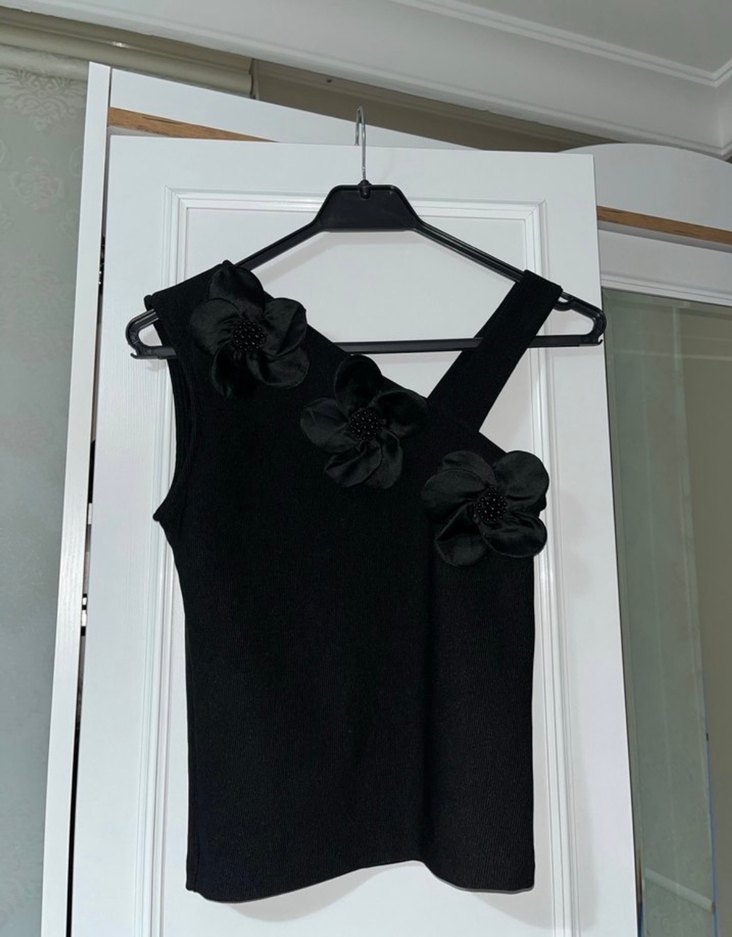 Siyah Çiçek Detaylı Tek Omuzlu Crop Top