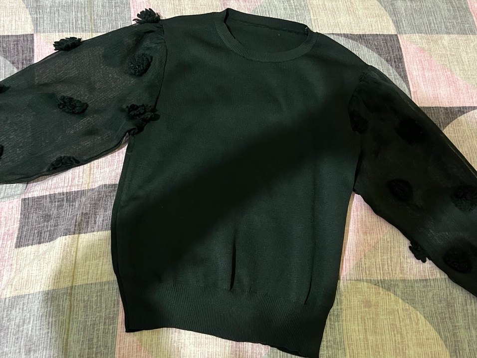 Siyah triko kumaştan,uzun kollu, yuvarlak yakalı, salaş ve midi boyda gündelik bluz. Standart beden