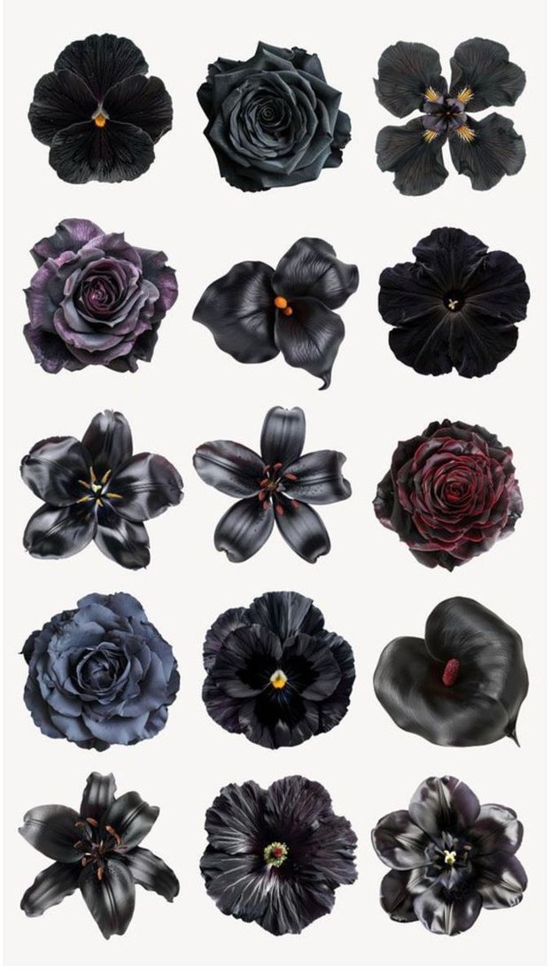 Farklı tasarımlarda siyah çiçek tırnak süsleri seti, tırnaklara şık ve karanlık bir dokunuş katar.