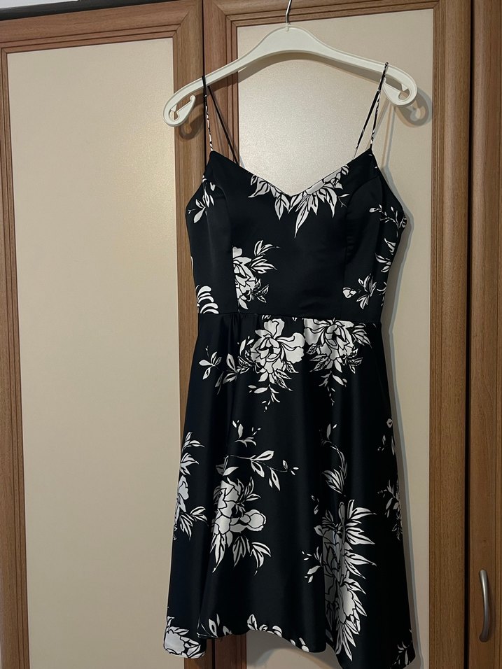 Sevda Aydın marka elbise. Siyah askılı mini elbise, straplez yaka ve dökümlü detaylara sahip, vintage esintili beyaz çiçek desenli. Günlük kullanıma uygun, trend gotik tarzda.