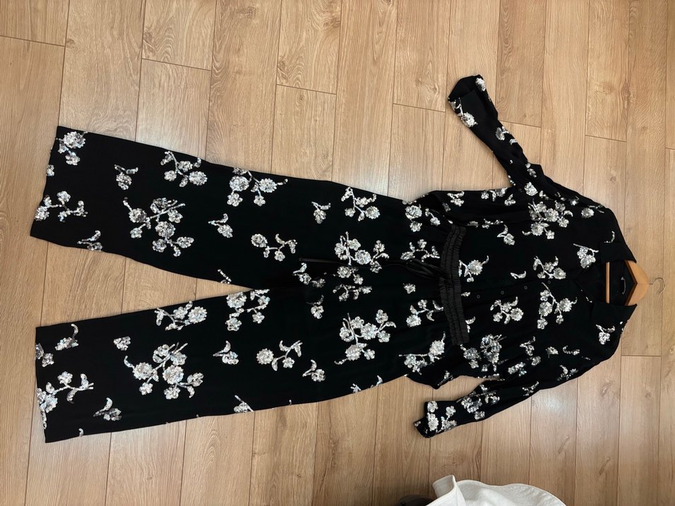 Kadınlar için uzun, bol kesim, askılı kollu tulum. Siyah ve koyu çiçek desenli, kemerli ve yakası kesik yakalı, bohem tarzında, günlük kullanıma uygun.