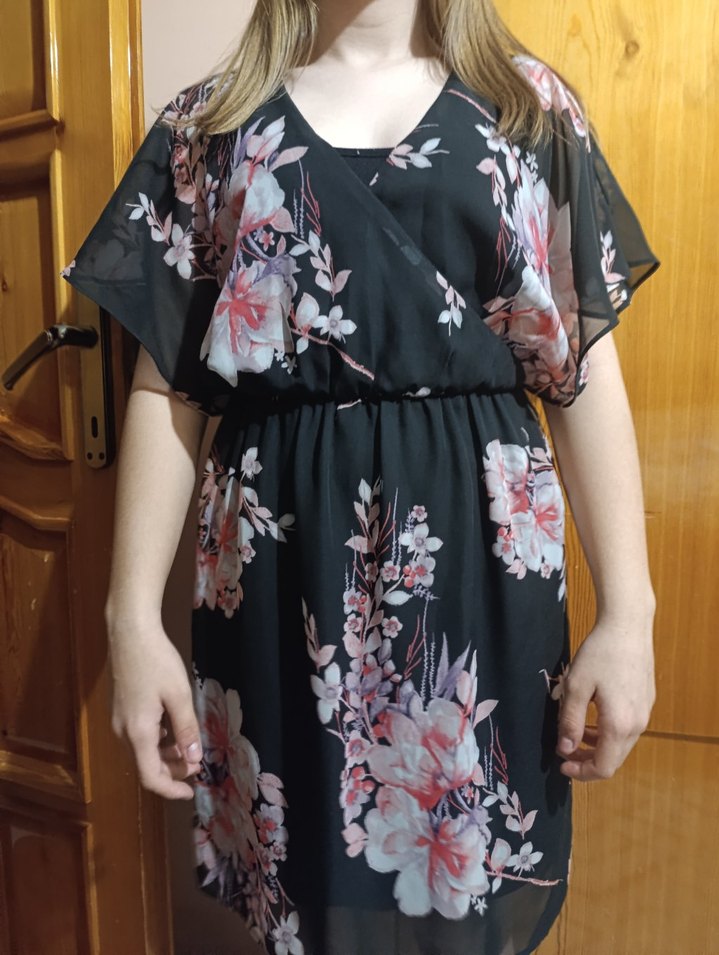 Siyah midi boy elbise, V yaka ve kısa dökümlü kollarla bol kesimdir. Yumuşak sentetik kumaştan yapılmış, çiçekli bohem desenlidir, romantik akşamlar için uygundur.