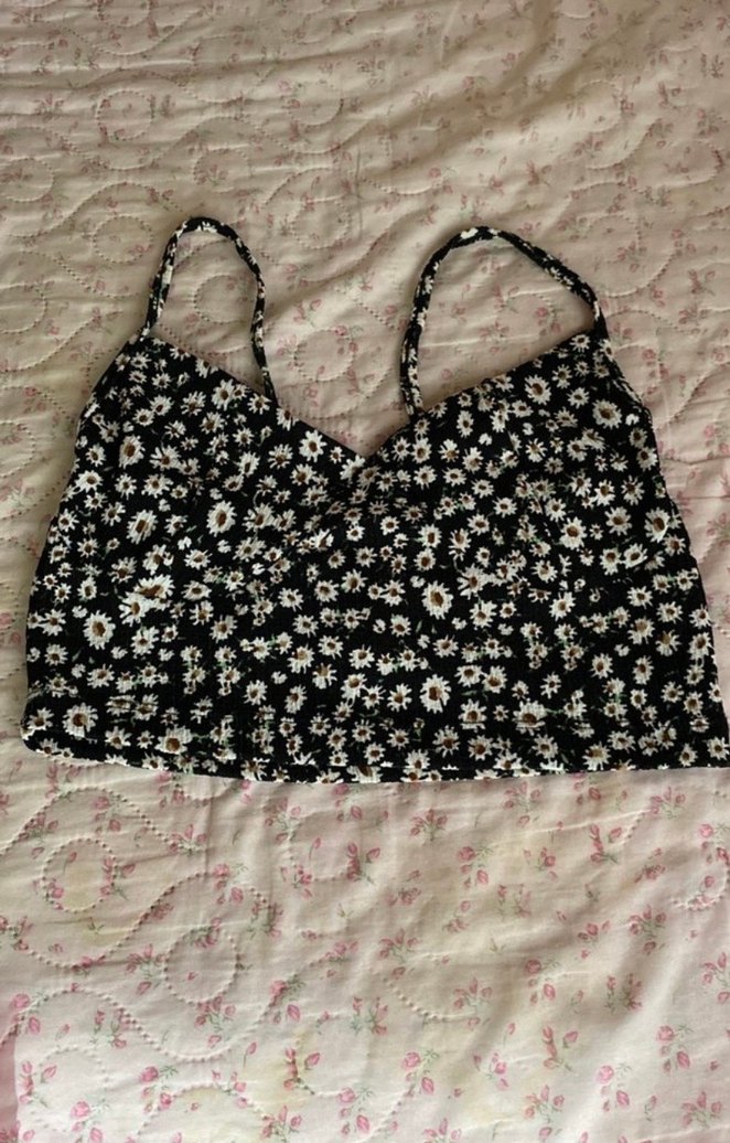 Siyah üzerine beyaz çiçek desenli, askılı ve bohem tarzda günlük kullanıma uygun büstiyer.