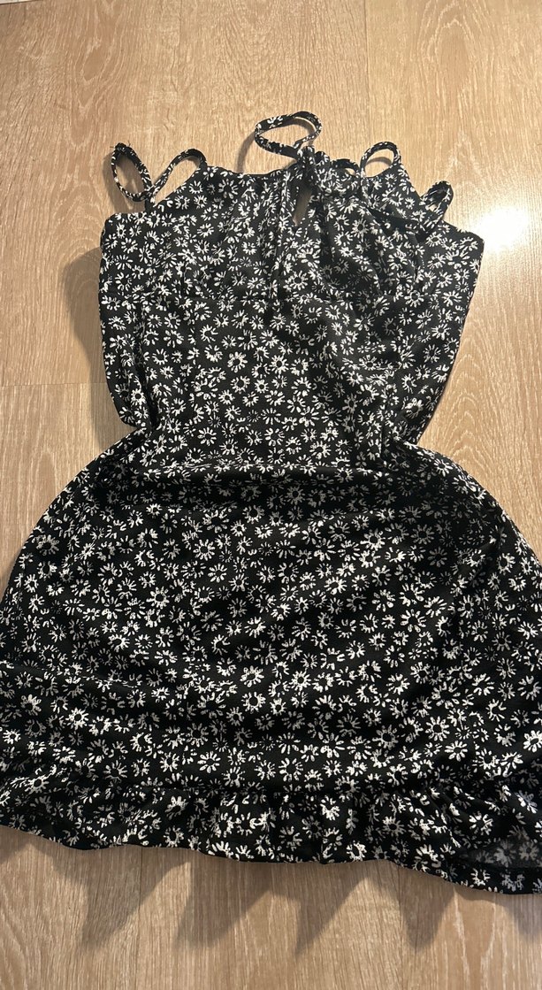 Siyah mini elbise, çiçek desenli, askılı ve fırfırlı detaylara sahip, bohem tarzı için uygun ve rahat bir modeldir.