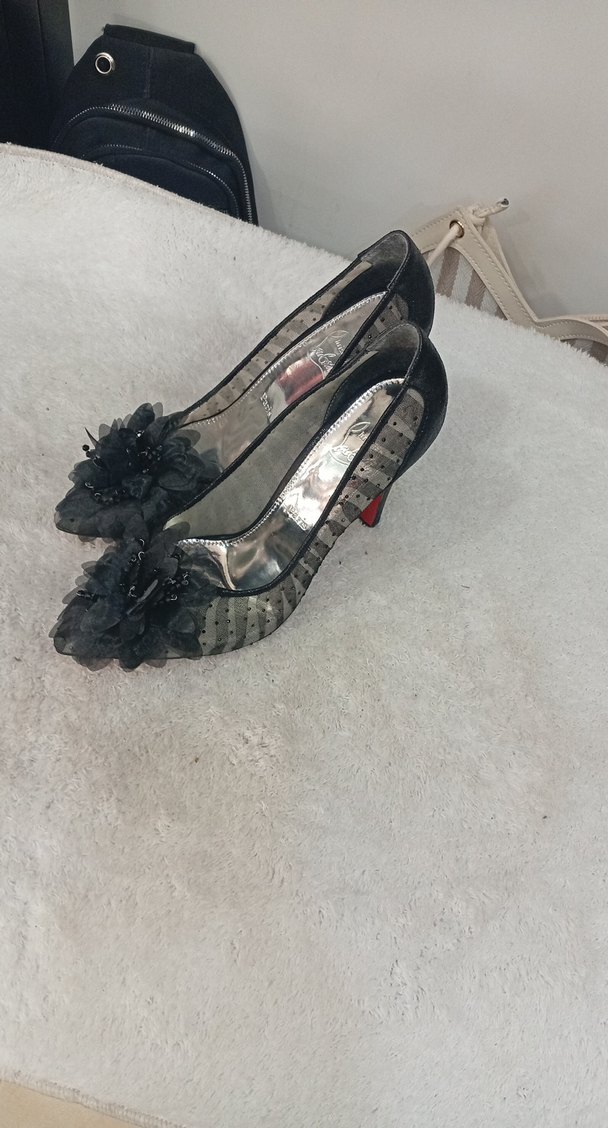 Siyah Çiçekli Fırfırlı Yüksek Topuklu Kadın Ayakkabı