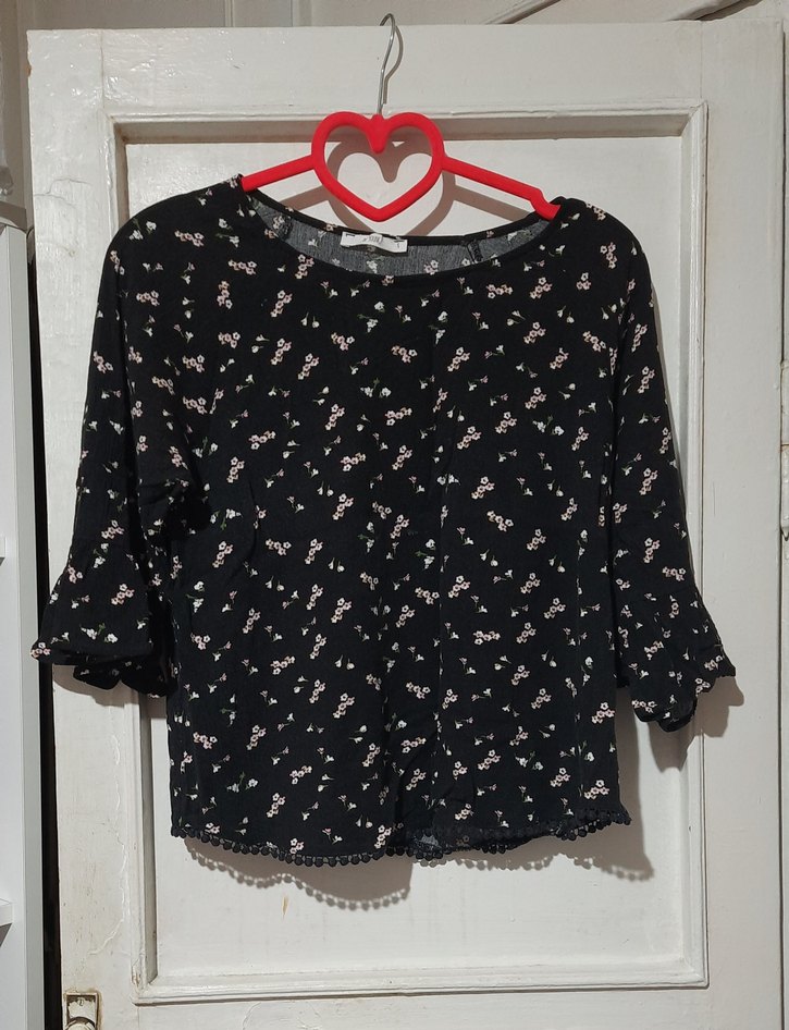 Siyah pamuklu bluz, yarım kol ve yuvarlak yakalıdır. Çiçek desenli, bol kesim, günlük kullanıma uygundur.