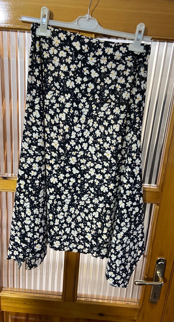 Yumuşak sentetik kumaştan yapılmış, Midi ve bol kesim kadın eteği. Siyah zemin üzerine çiçek desenli, bohem ve retro tarzda drapeli tasarıma sahiptir. Asimetrik kesim.