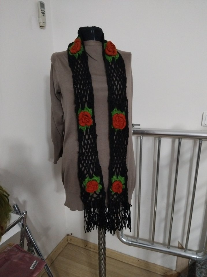 Siyah renkli, kırmızı çiçek detaylı ve püsküllü örgü bohem stil kadın atkısı.hiç kullanılmadı