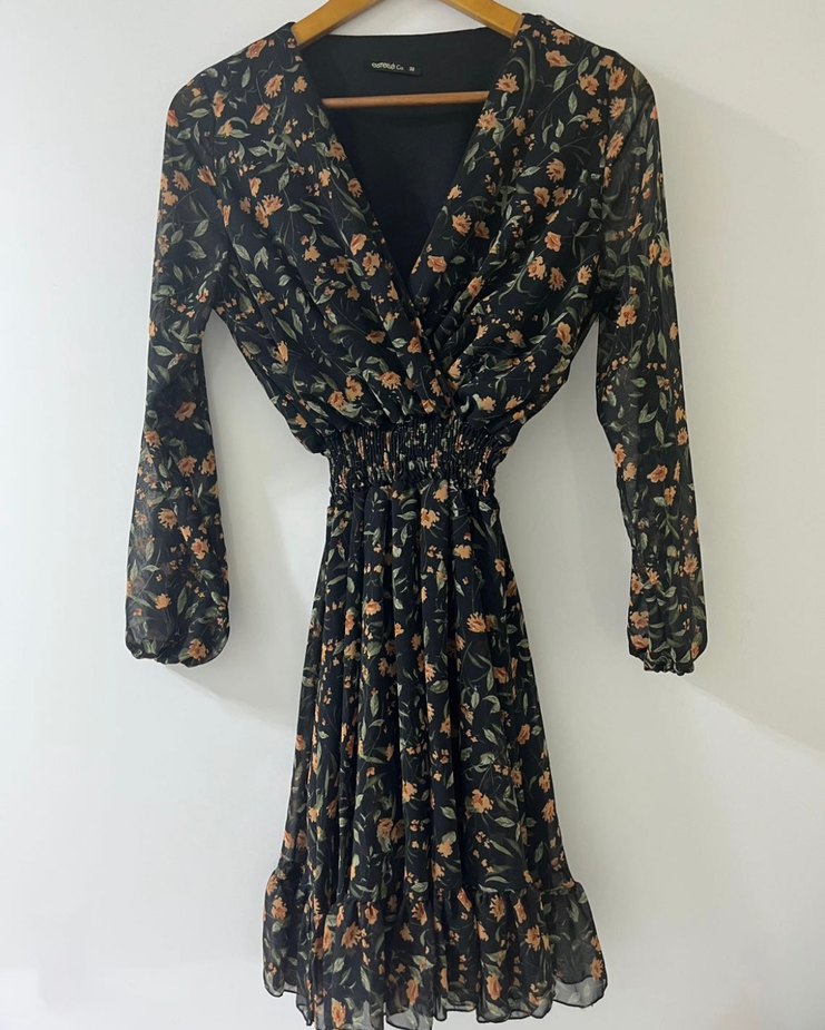 Siyah, uzun kollu, çiçek desenli bohem elbise. V yaka, fırfır detaylı ve bol kesimdir. Yumuşak sentetik kumaştan üretilmiştir.