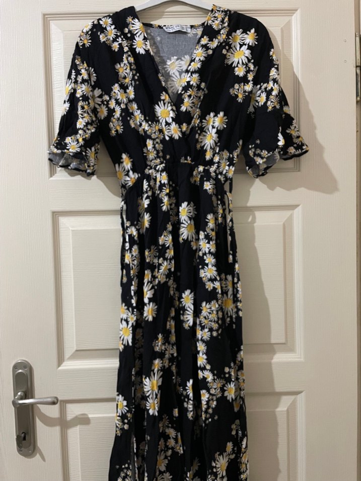 Bu uzun siyah elbise, çiçek desenleri ve fırfırlı kısa kollara sahip bol kesimdir. V yakalı, yumuşak sentetik kumaştan yapılmıştır, gündelik bohem tarz için uygundur.