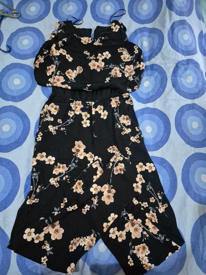Askılı, uzun ve bol kesim tulum, yumuşak sentetik kumaş üzerine çiçek desenlidir. Fırfır detaylı, bohem tarzda günlük kullanıma uygundur.