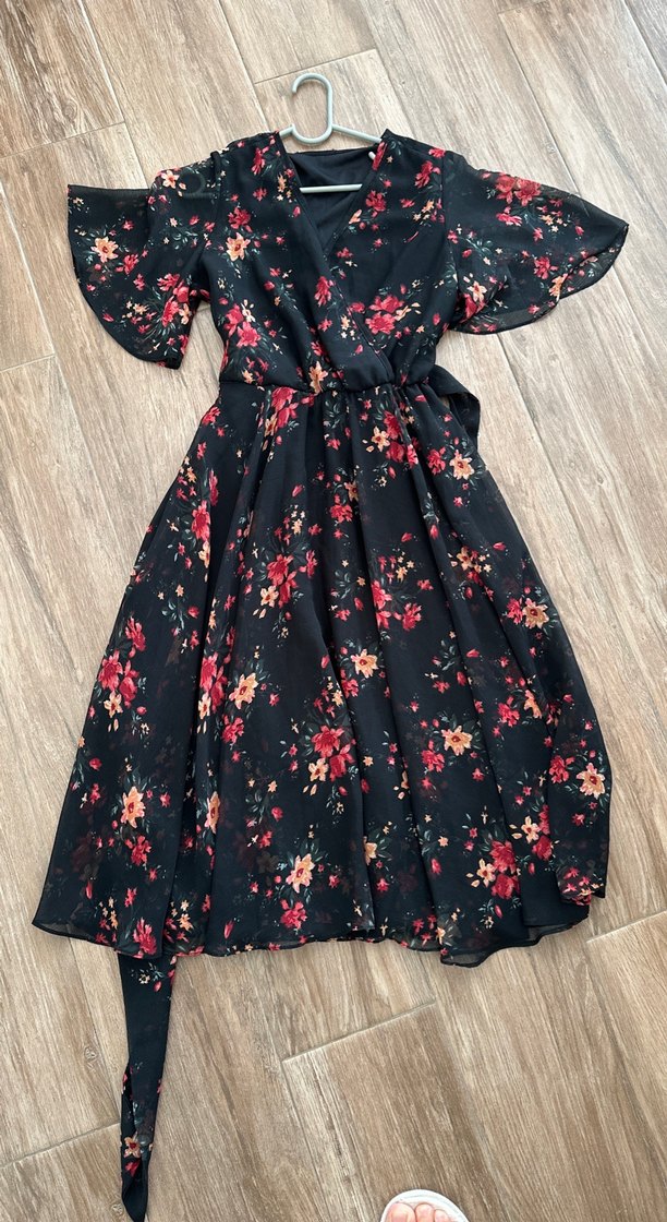 Siyah taban üzerine canlı çiçek desenli, uzun boy, bol kesim, kısa kollu ve V yakalı elbise
