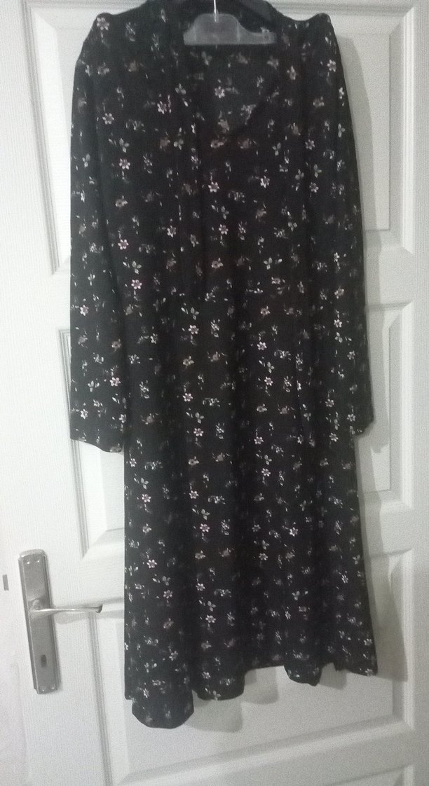Siyah çiçek desenli, uzun kollu, bol kesim ve drapeli uzun elbise. V yaka tasarımıyla gotik ve bohem tarzı harmanlar.